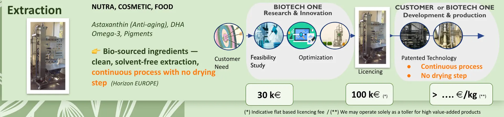 Whether you aim to validate a proof of concept, deploy a continuous extraction technology on your production site, or secure high-value bio-sourced ingredients, Extract-X™ provides a proven, industrial-ready solution. Biotech One can: